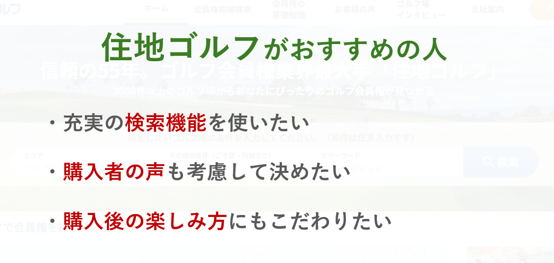 比較検討をじっくり進めたい方には、支配人インタビューやお客様の声など情報量が豊富な住地ゴルフ。