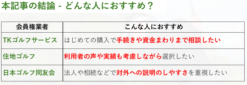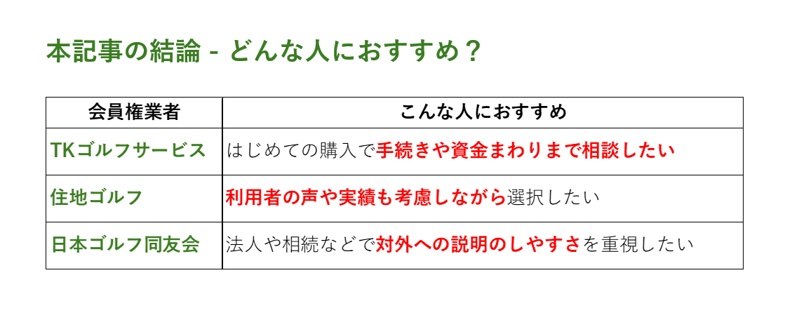本記事では、そんな不安をひとつずつ解消できるように、TKゴルフ/住地ゴルフ/日本ゴルフ同友会の3社をランキング形式でします。